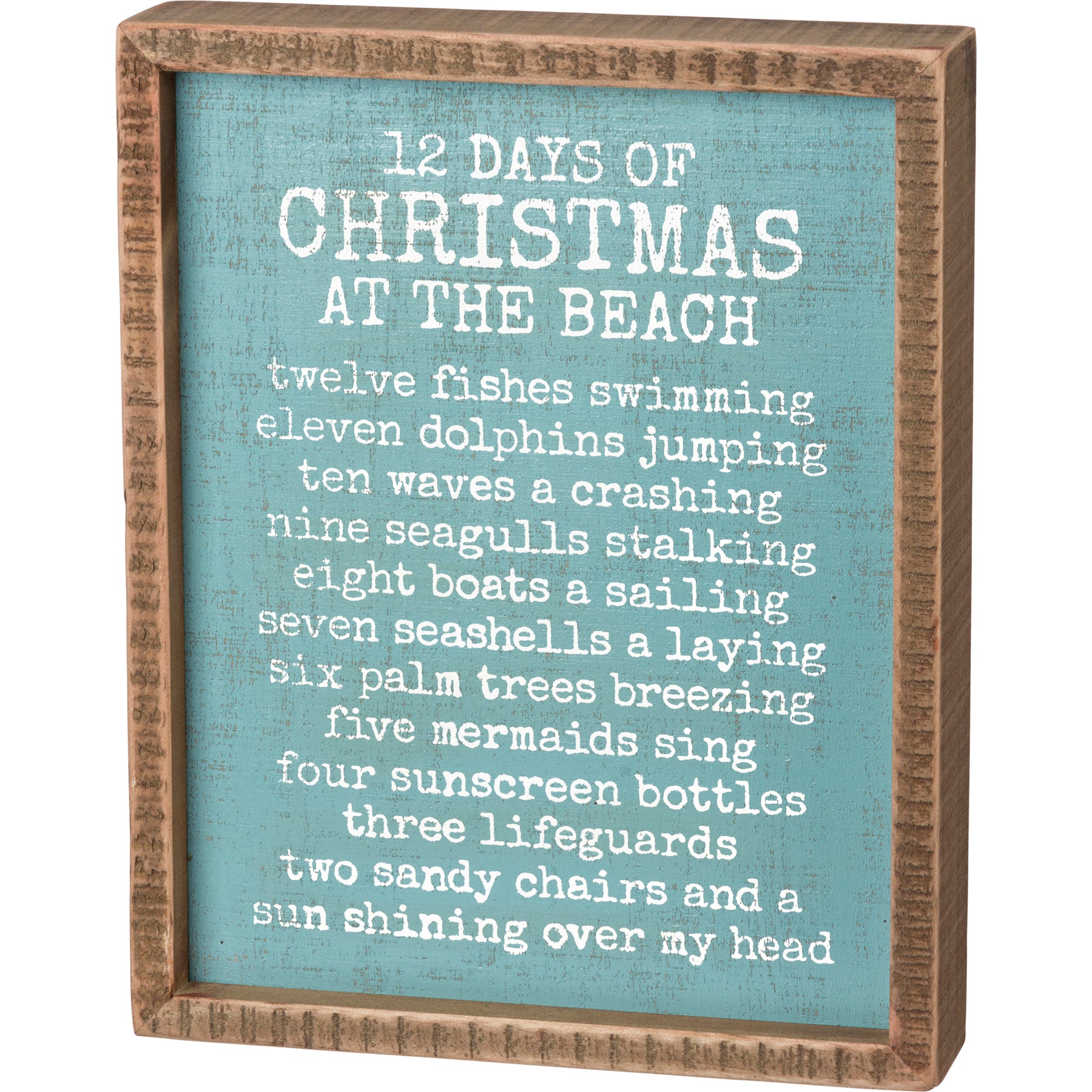 An inset box sign that's perfect for a Christmas spent at the beach featuring a distressed "12 Days Of Christmas At The Beach" lyrical sentiment in a beach-inspired palette with natural wood trim. Complements well with coordinating styles for a cohesive collection. Easy to hang or can free-stand alone.