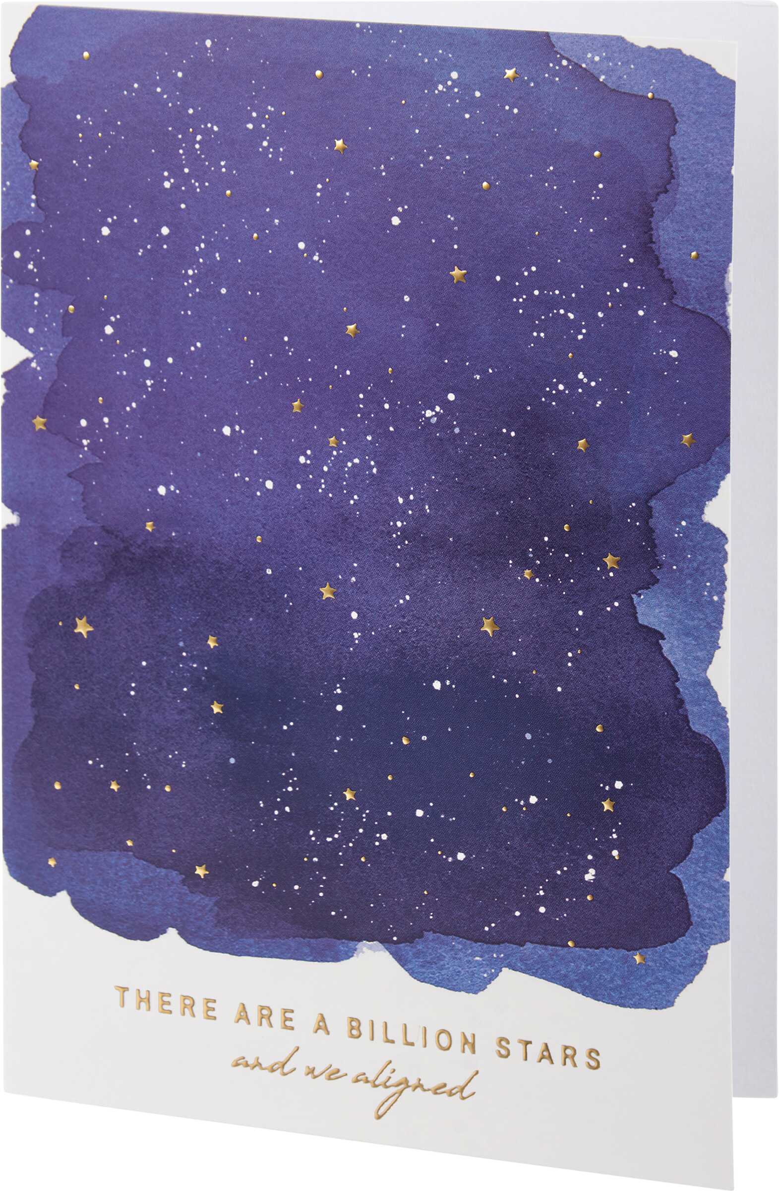 A charming greeting card from our Greeting Card Collection displaying a night sky design with gold foil stars and sentiment that create a shiny texture you can feel. The front of the card features "There Are A Billion Stars And We Aligned" sentiment with a blank space inside to create a personalized message. Each card includes a brown kraft paper envelope for the perfect finishing touch. A Billion Stars We Aligned greeting card is proudly made in the USA.