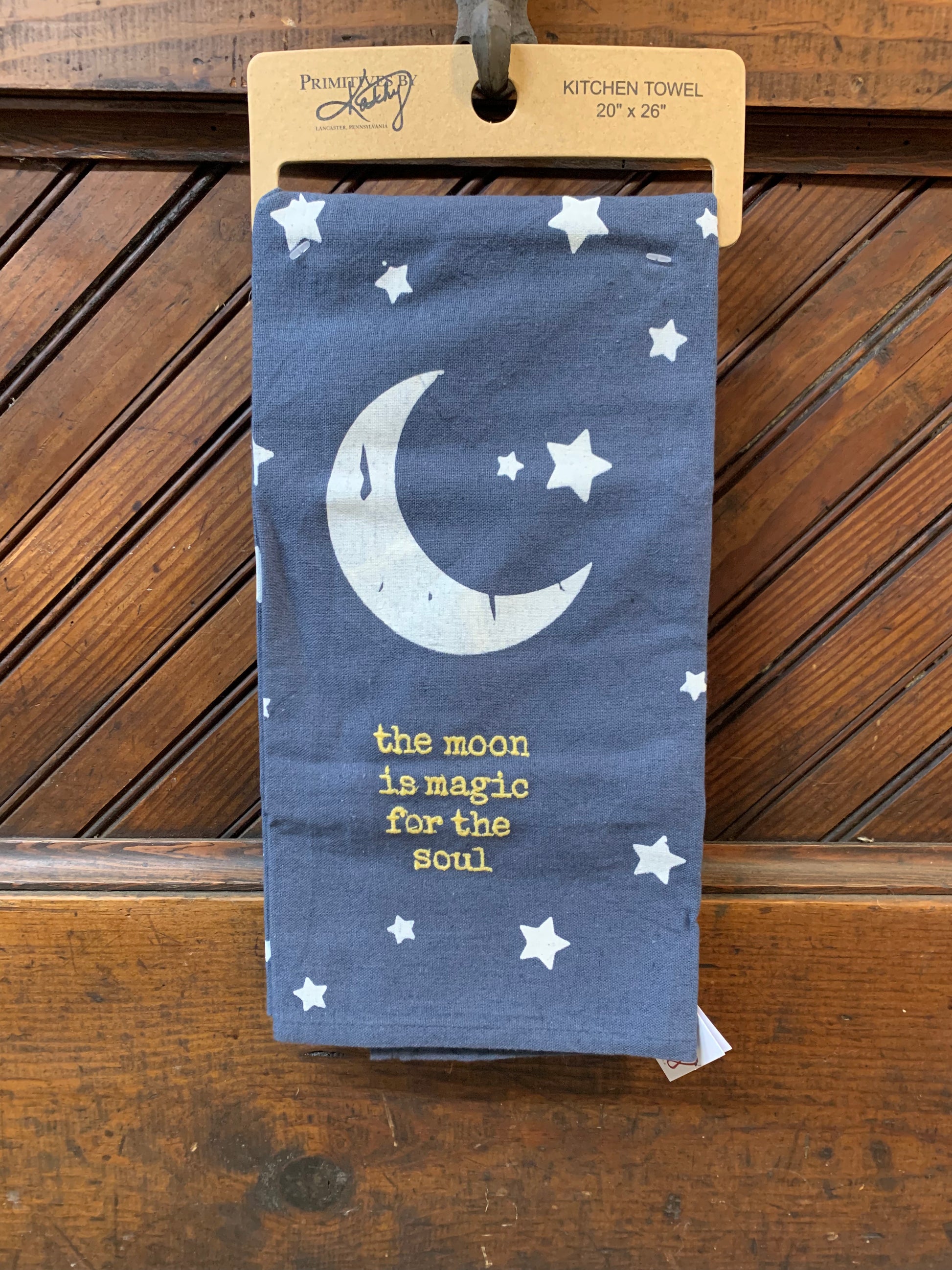A cotton linen blend kitchen towel from our Celestial Collection features an all-over star design with embroidered "The Moon Is Magic For The Soul" sentiment and moon design. Our The Moon Is Magic For The Soul kitchen towel is machine-washable. Towel is packaged on a cardboard hanger to easily hang on rack.
