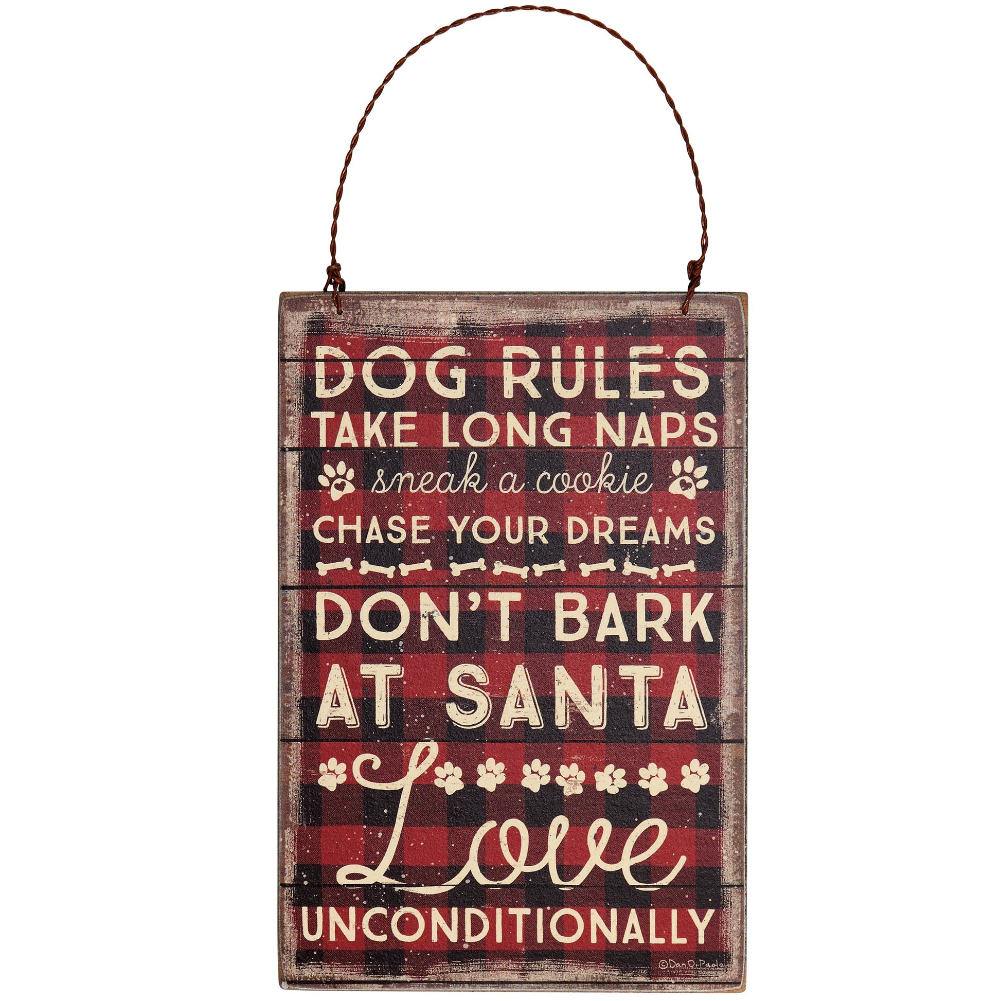 Featuring a pet inspired holiday design in a rustic style. Design displays a fun pet-themed sentiment that reads "Dog Rules - Take Long Naps - Sneak A Cookie - Chase Your Dreams - Don't Bark At Santa - Love Unconditionally." Seasonal ornament also features distressed details with coordinating black color on the sides and back. Our Dog Rules ornament is easy to hang for display via attached twisted wire hanger. A fun pet-themed ornament perfect for seasonal display.
