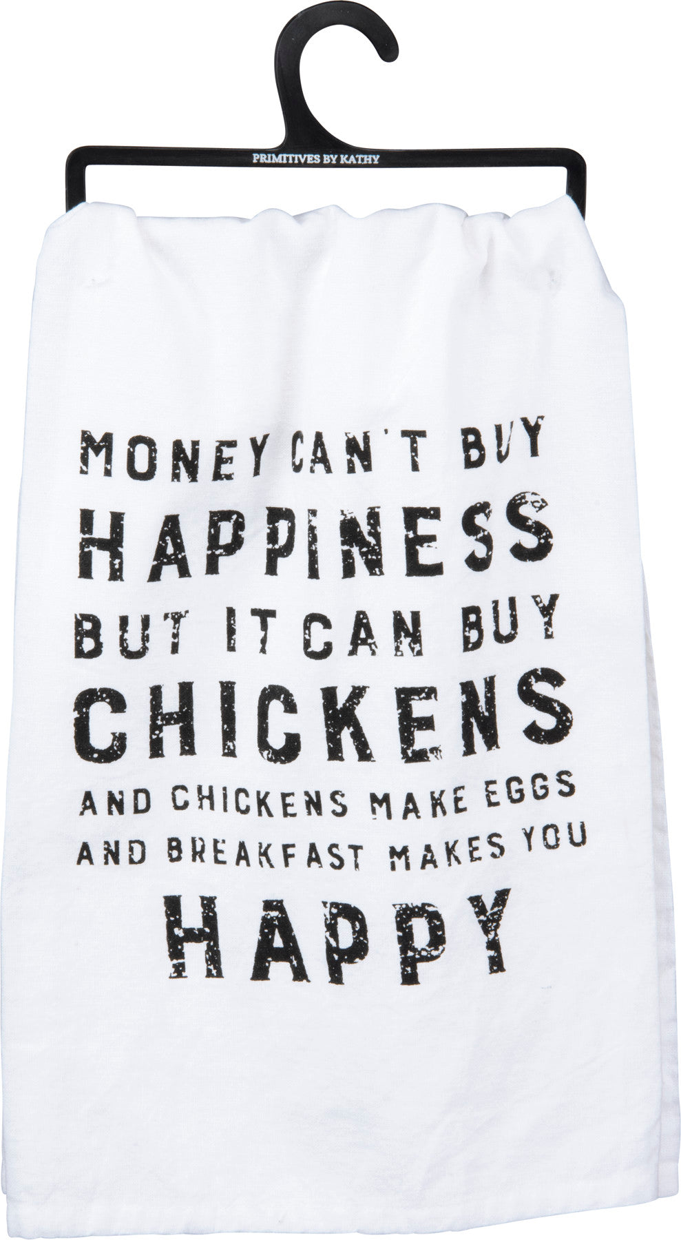 A black and white cotton kitchen towel lending a distressed "Money Can't Buy Happiness But It Can Buy Chickens And Chickens Make Eggs And Breakfast Makes You Happy" sentiment that complements well with existing kitchen decor. Machine-washable.